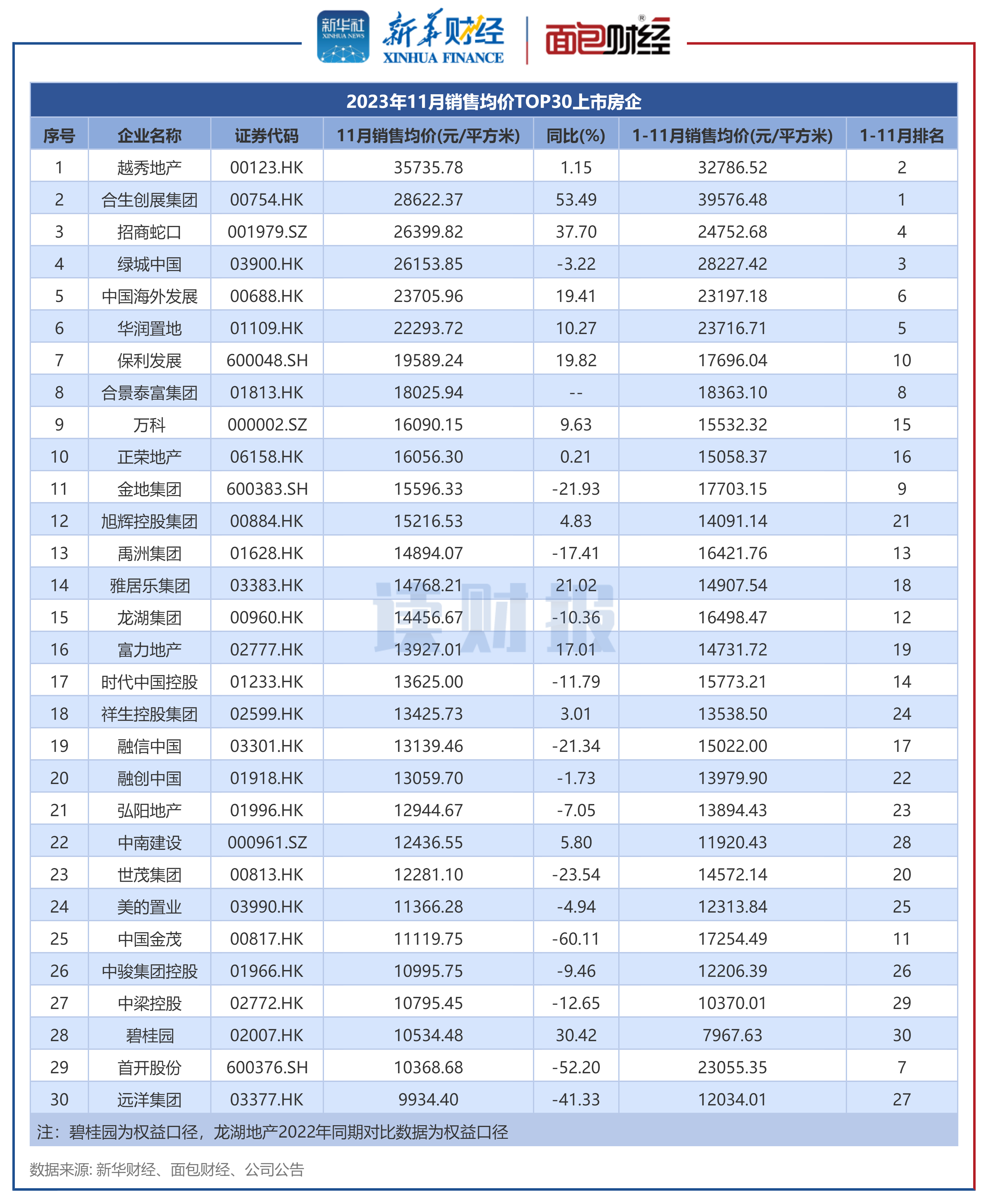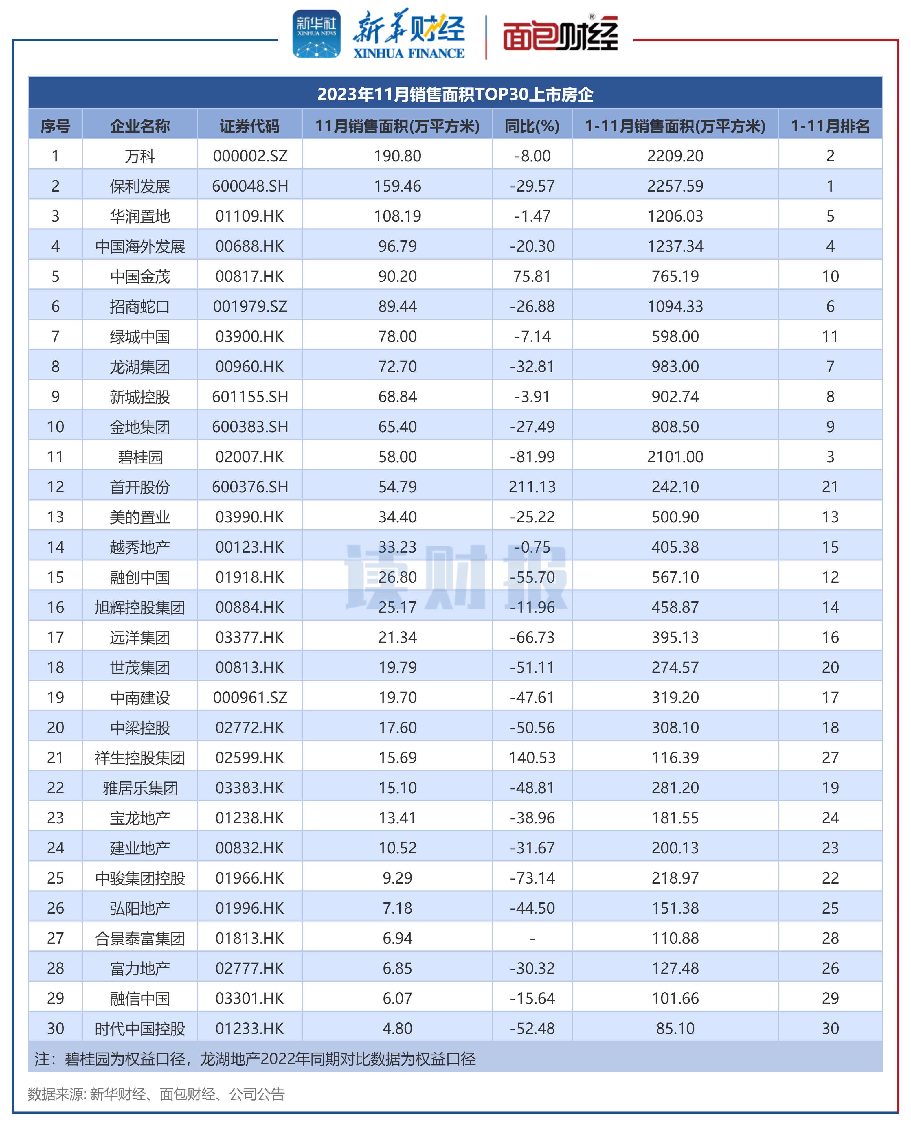 主流上市房企2023年11月销售数据已经披露完成。新华财经和面包财经研究员在剔除部分数据披露不全的上市房企后,以沪、深、港三大交易所主要上市房企为样本,分别统计了销售金额、销售面积以及销售均价排名前三十的企业。