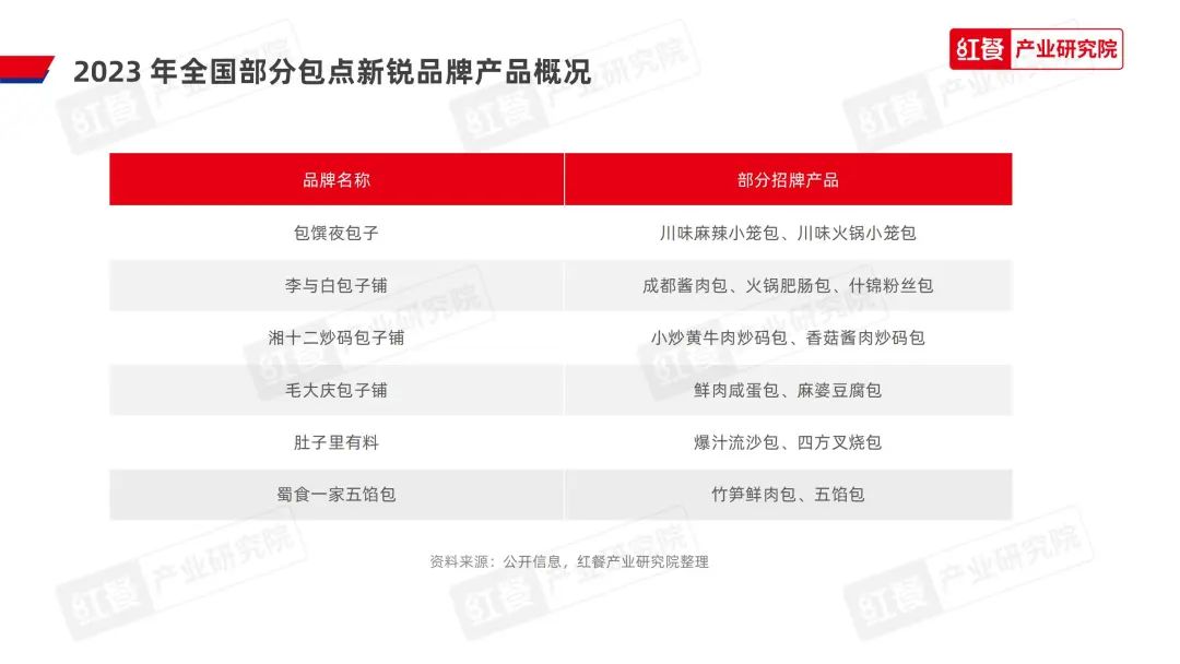 第三类则是近年来崛起的、创新能力颇强的新锐品牌,其对包点品牌的调性、产品、消费场景上作出了革新,代表品牌有包馔夜包子、李与白包子铺、湘十二炒码包子铺、毛大庆包子铺等。