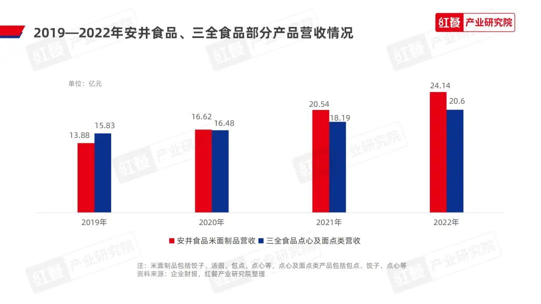 财报显示,安井食品的米面制品营收从2019年的13.88亿元上升至2022年的24.14亿元,三全食品的点心及面点类产品营收从2019年的15.83亿元上升至2022年的20.6亿元。