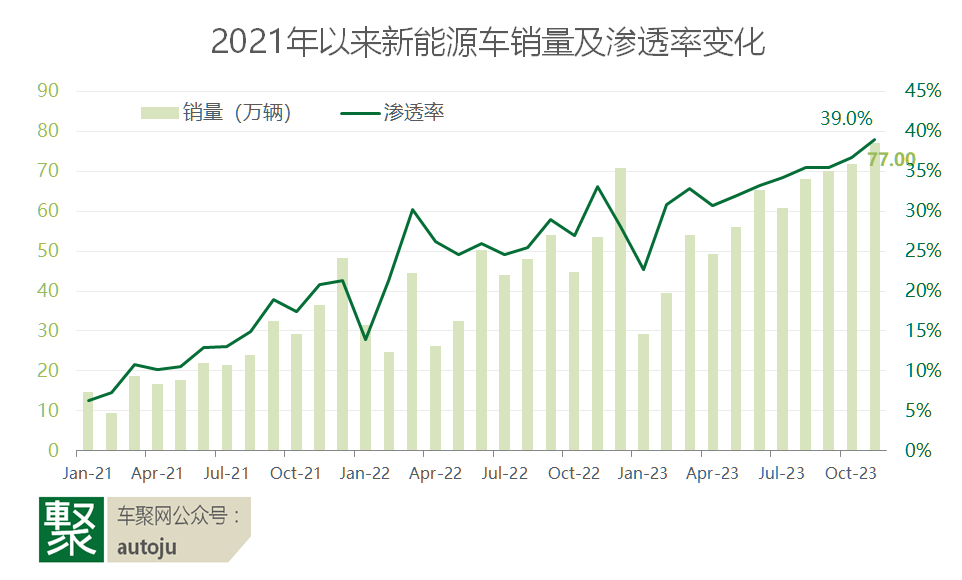 上险数显示,2023年11月国内新能源销量已达77万辆,同比增长43.9%,环比提升7.3%,在当期乘用车市场的渗透率为39%,接近40%,即每销售5辆新车,约有2辆是新能源车。