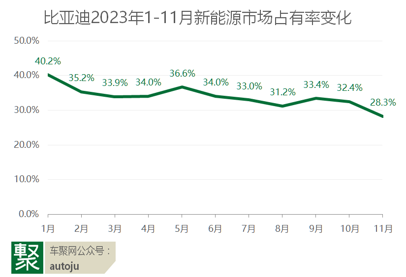 市场瞬息万变,比亚迪虽有着绝对领先的优势,但这并不意味着它的道路一切顺利,以当前形势来看,就面临市场激烈竞争带来的压力。从数据来看,2023年,比亚迪下半年的市占率明显低于上半年,而11月28.3%的市占率创今年以来最低水平。