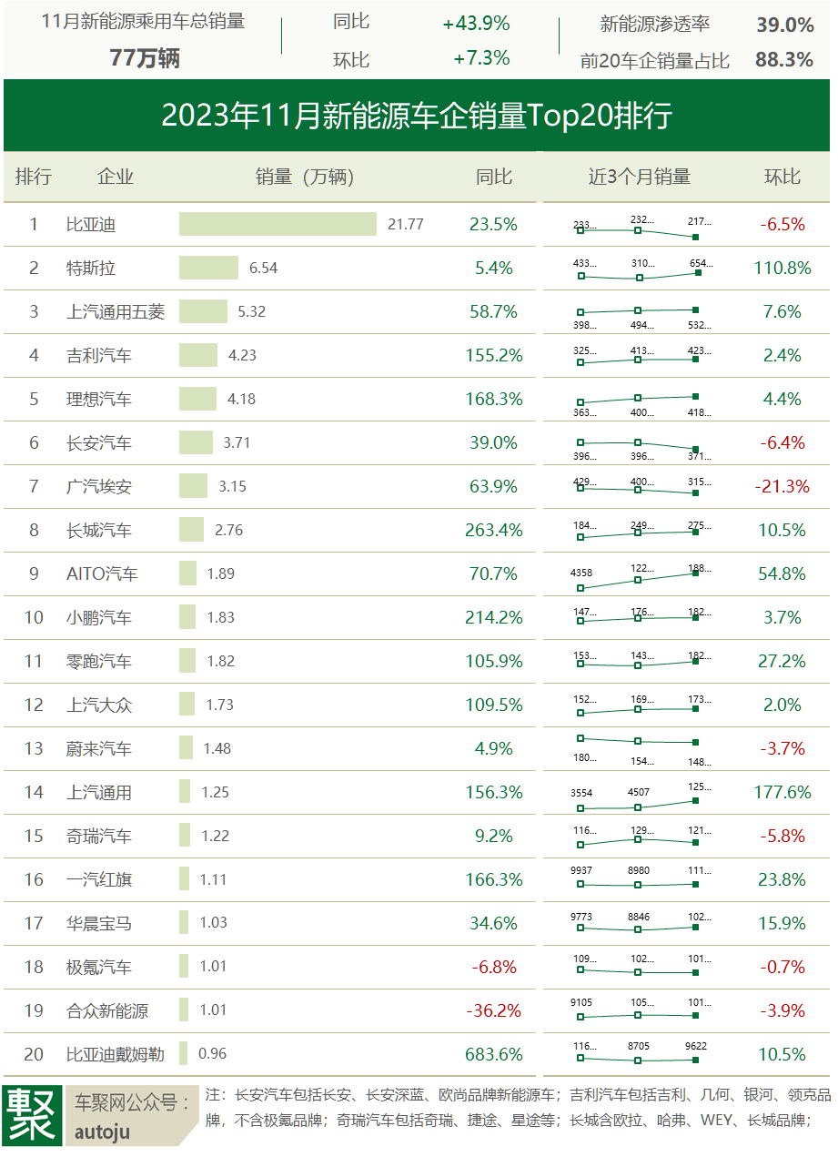 新能源市场中,比亚迪仍是销冠,11月以21.77万辆销量、28.3%的市占率继续“领导”新能源市场。