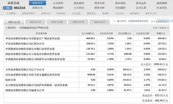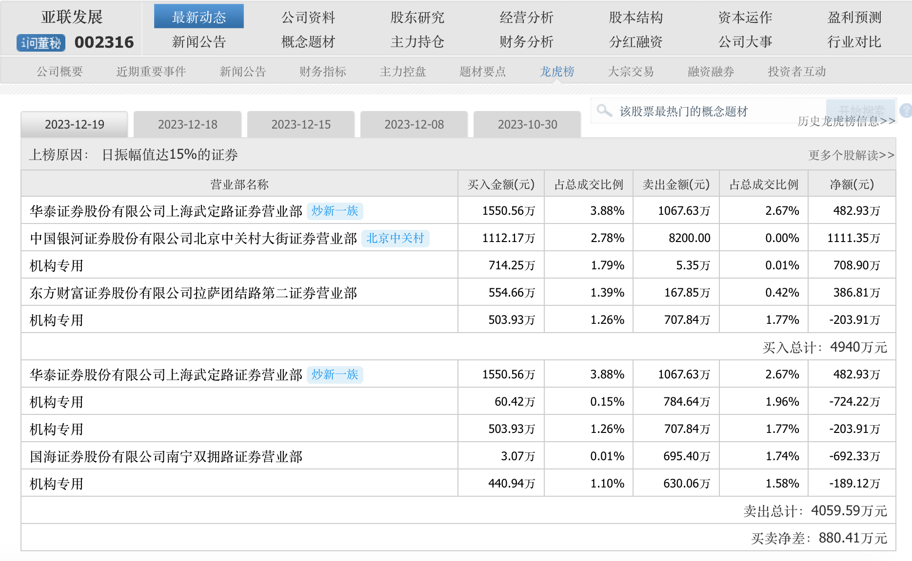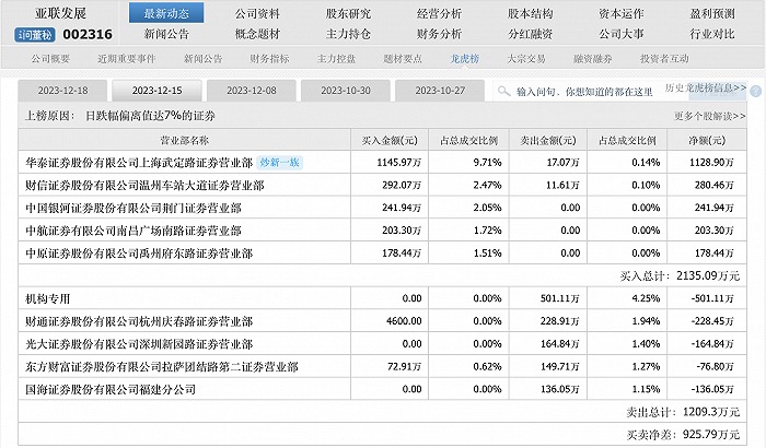 如果以12月15日5.69元跌停价来计算,华泰证券上海武定路营业部相当于一口气吃进了约200万股。由于亚联发展9月末第九大流通股东的持股数为194.11万股,可见其一把操作,可以直接跻身十大流通股东名单。
