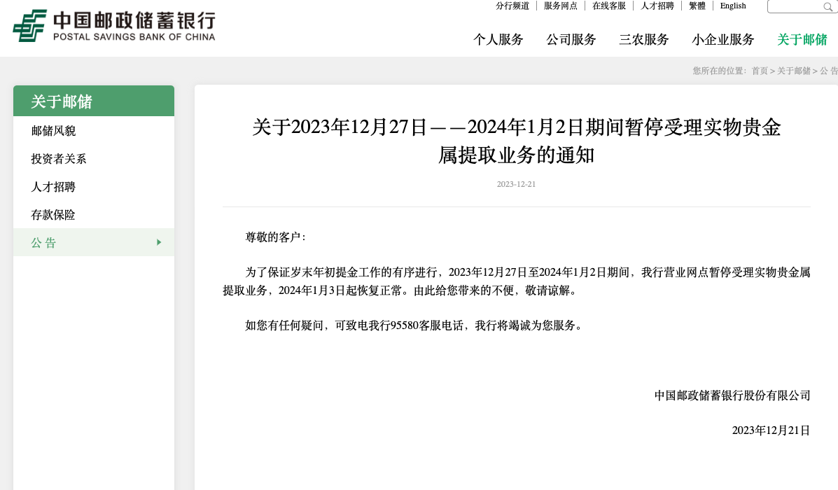 12月21日,邮储银行发布通知:为了保证岁末年初提金工作的有序进行,2023年12月27日至2024年1月2日期间,我行营业网点暂停受理实物贵金属提取业务,2024年1月3日起恢复正常。