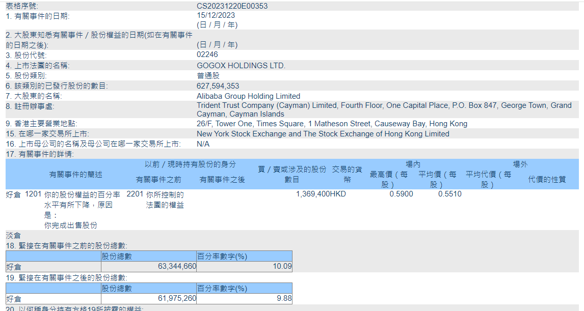 港交所文件显示,阿里巴巴在12月15日出售了136.94万股快狗打车股份,平均减持价格为每股0.551港元,持股比例从10.09%下降至9.88%。