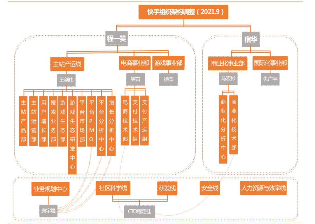 8月,职级体系调整;9月,研发线取消基础技术部、成立基础平台部和基础设施部,前CTO陈定佳、前CFO钟奕祺、宿华的前业务助理彭佳瞳等多名高管离职,快手经营管理委员会成员、宿华妻子唐宇煜也不再负责一线业务。随着今年10月,程一笑将宿华担任的董事长一职也接任过来,宿华彻底隐退,快手的完全单核时代才算真正开启。