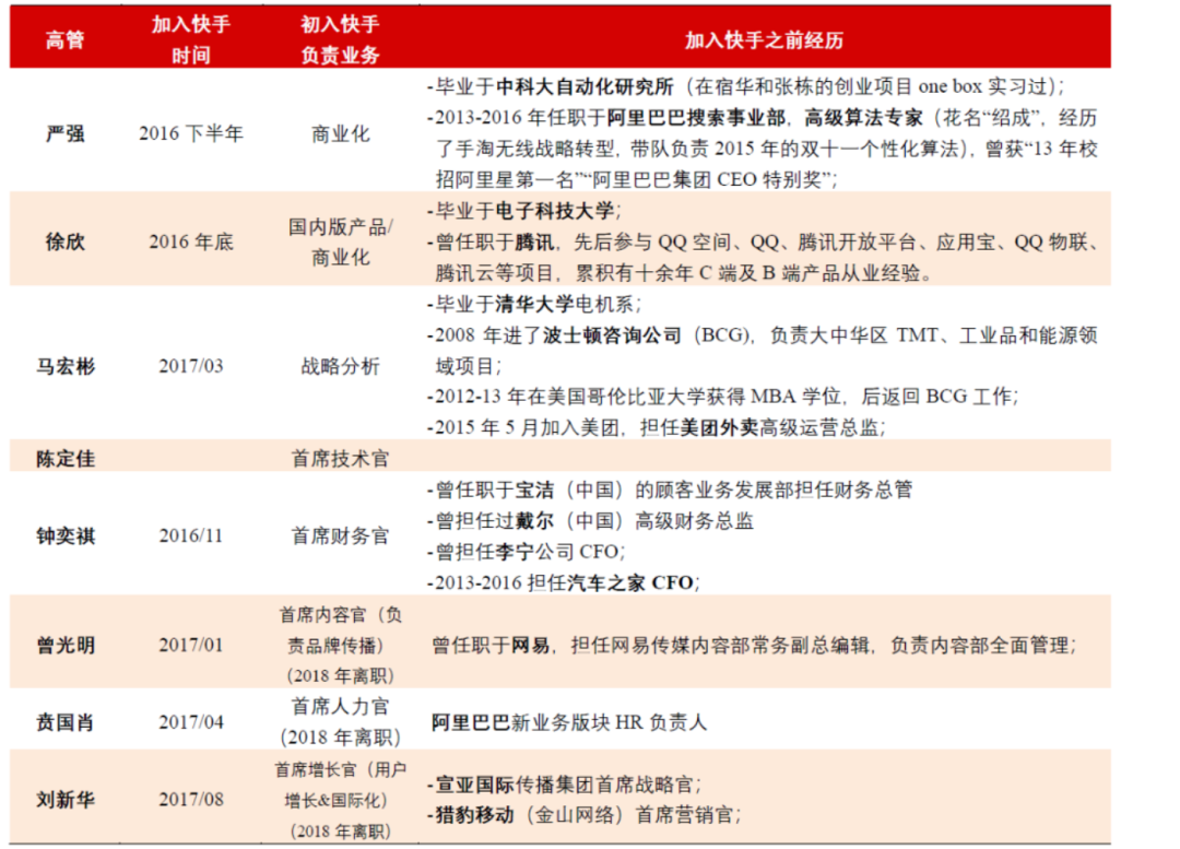 2016年下半年开始,快手陆续从阿里、美团、腾讯、网易等互联网大厂的手里引进众多高管,包括后来的CFO钟奕祺,商业化负责人马宏彬等人均是在这一时期加入到了这个新组建的“CXO职业经理人”团队。