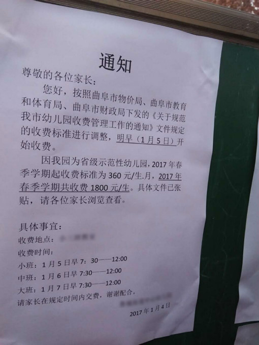 据澎湃新闻报道,日前,山东省济宁市曲阜市多名幼儿园学生家长反映称,2017年1月4日,曲阜市多所幼儿园在门口贴出通知,对幼儿园收费进行调整,其中,实验示范性幼儿园2017年春季学期起收费标准为360元/生·月,2017年春季学期共收费1800元/生,比此前的825元/生涨了一倍多,1月5日开始收费。