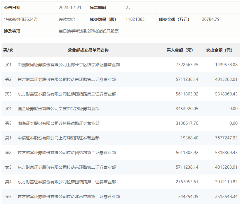 12月21日,华密新材今日跌18.9%,龙虎榜数据显示,上榜营业部席位全天成交5443.51万元,占当日总成交金额比例为20.32%。其中,买入金额为2856.09万元,卖出金额为2587.41万元,合计净买入268.68万元。