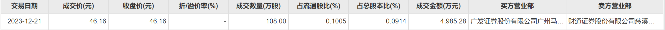 12月21日,合盛硅业今日大宗交易成交108万股,成交额4985.28万元,占当日总成交额的15.71%,成交价46.16元,较市场收盘价持平。