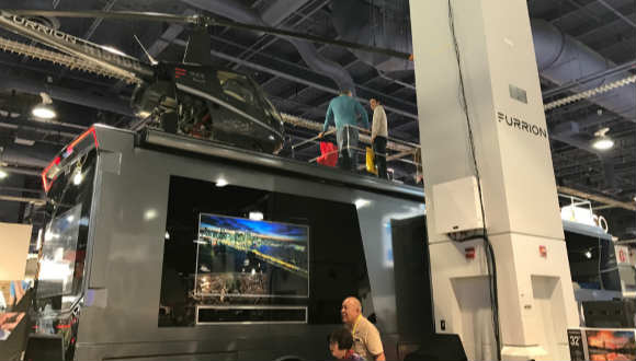 为了凸显这种理念,该公司在CES展台停放了一辆房车不算,还在上面摆放了一辆直升飞机。房车里到处都是FURRION的产品,比如汽车上的显示屏、厨房电器(抽油烟机、微波炉)、壁炉、马桶甚至卧室的窗帘等等。而且这些产品均能够实现自动化,可以让你的生活处处充满高科技。