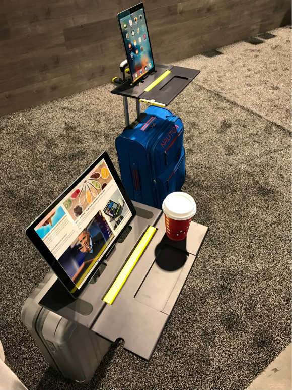 不用的时候可以折叠收起,需要的时候打开固定在行李箱的拉杆上,就变成了一个可以放水杯和平板的桌面。