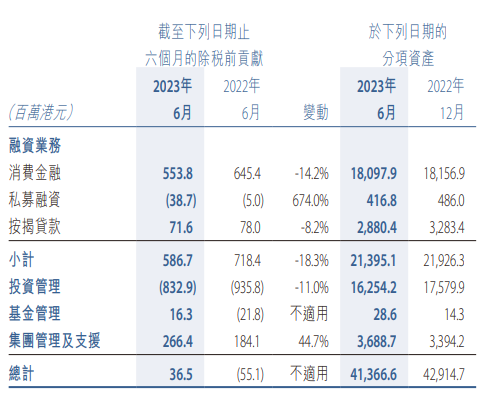 根据财报,2023年上半年,融资业务贡献除税前溢利5.88亿港元,与2022年上半年的7.18亿港元相比,同比降低了18.33%。