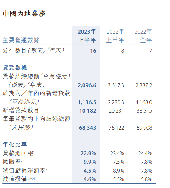 截至2023年上半年,香港地区实现贷款余额90.80亿港元,去年同期为87.04亿港元;而内地实现贷款余额20.97亿港元,而去年同期为36.17亿港元,同比缩减了72.53%。