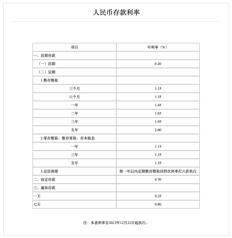 12月22日,中国农业银行官网显示,农行于12月22日下调人民币存款利率,其中定期整存整取三个月、半年和一年期利率均下调10个基点,一年期利率降至1.45%;二年期下调20个基点至1.65%;三年期和五年期均下调25个基点,分别至1.95%和2.00%。零存整取、整存零取、存本取息利率下调10个基点,通知存款挂牌利率下调20个基点。