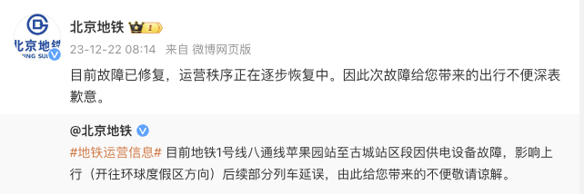 @北京地铁 发布,地铁1号线八通线苹果园站至古城站区段因供电设备故障,影响上行(开往环球度假区方向)后续部分列车延误。
