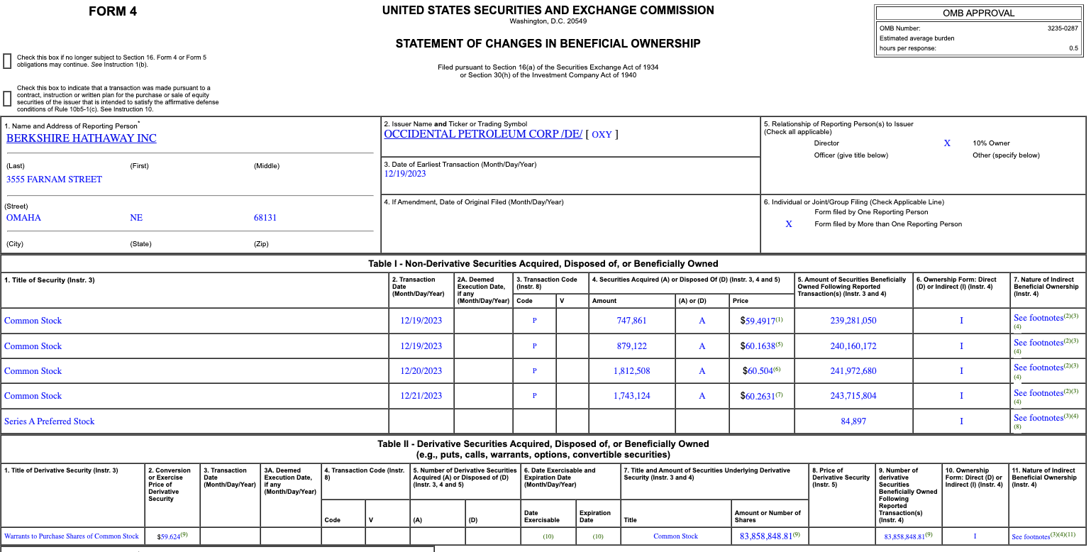 当地时间12月21日,伯克希尔·哈撒韦公司在提交给美国证券交易委员会的文件中披露,于12月19日-21日增持合计5,182,615股西方石油股票,持股数量增至243,715,804股。