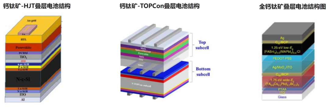 从产品路线来看,钙钛矿电池可分为单结电池和叠层电池。单结钙钛矿电池指只有一个PN结的钙钛矿太阳能电池,叠层电池包括全钙钛矿叠层,或者钙钛矿与晶硅叠层。
