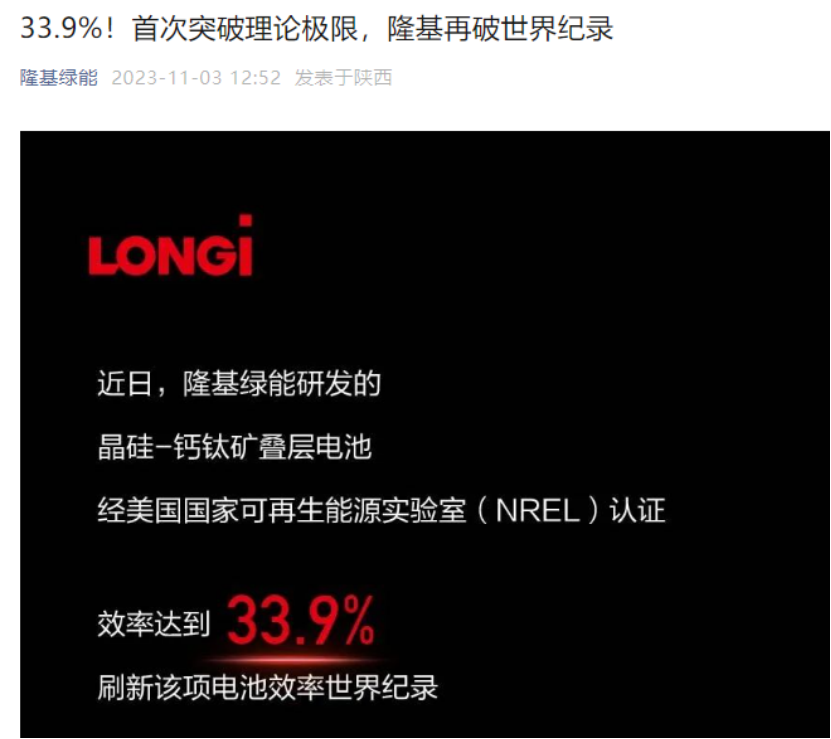 11月3日,光伏“一哥”隆基绿能宣布钙钛矿/晶硅叠层电池经NREL认证效率达33.9%,刷新世界纪录。