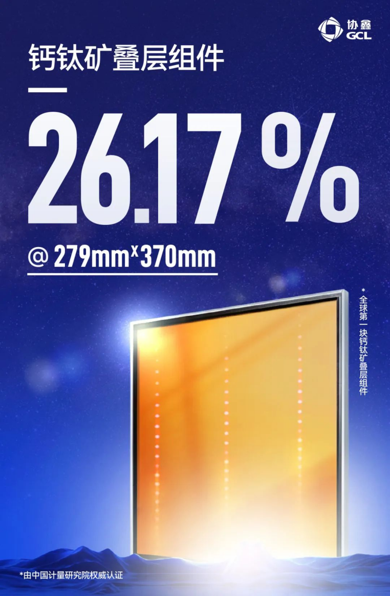 20天之后,协鑫光电在279mm×370mm面积基础的钙钛矿叠层组件效率达到26.17%,号称是全球第一块真正意义上的钙钛矿叠层组件。12月14日再度取得前文提及的突破。