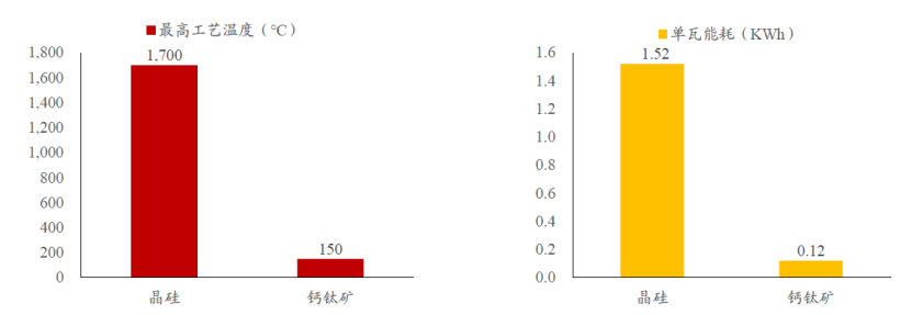 相比之下,钙钛矿材料只需要95%的纯度即可。同时,钙钛矿不需要像硅一样反复以数千度的高温提纯,通常在不超过150度的低温环境中制备,两者生产能耗相差巨大。综合比较下,钙钛矿光伏电池组件单瓦能耗仅为晶硅组件的1/10。
