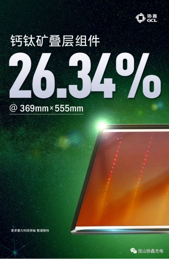 12月14日,协鑫光电宣布369mm×555mm钙钛矿叠层组件光电转换效率达到26.34%。