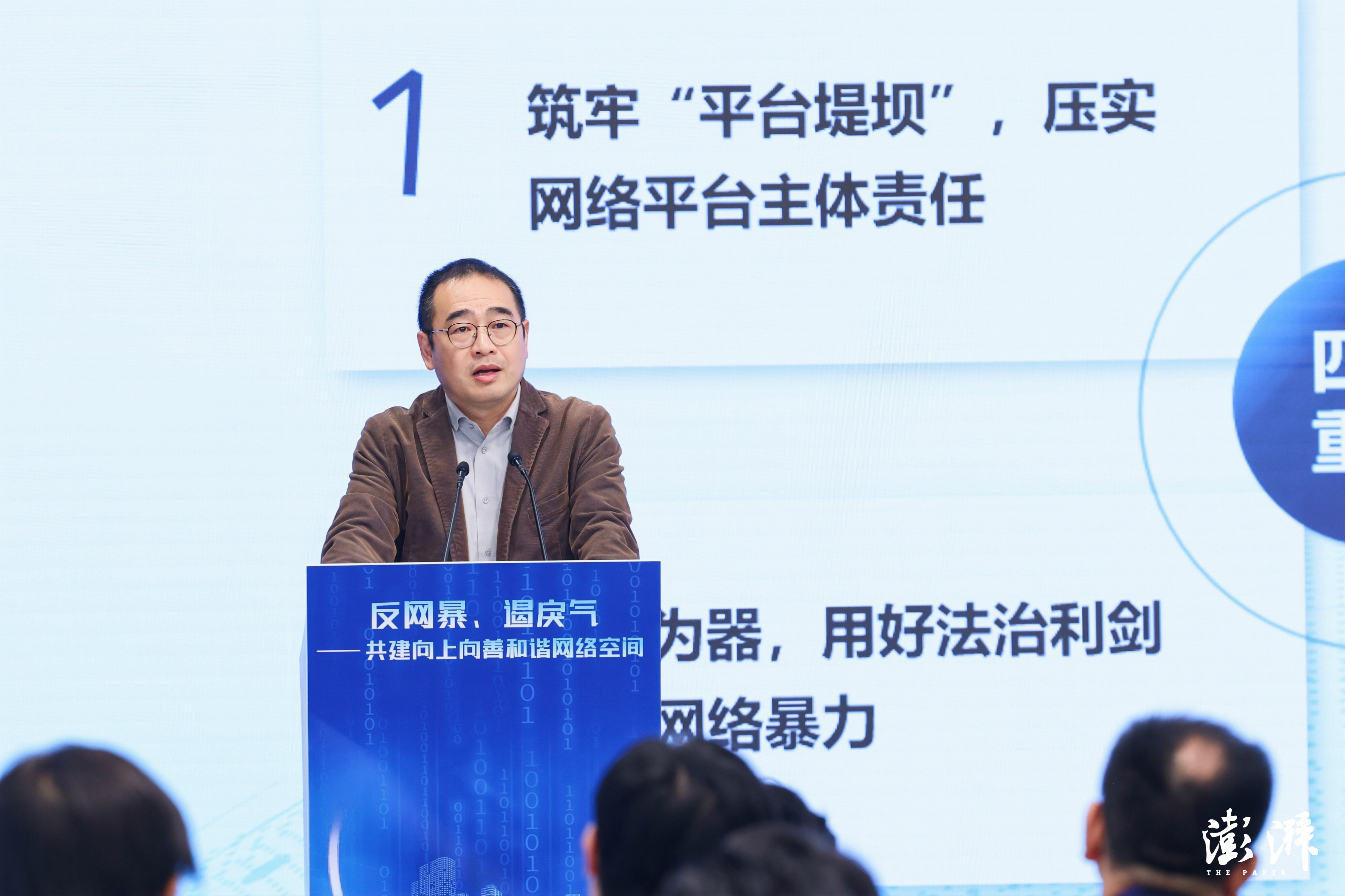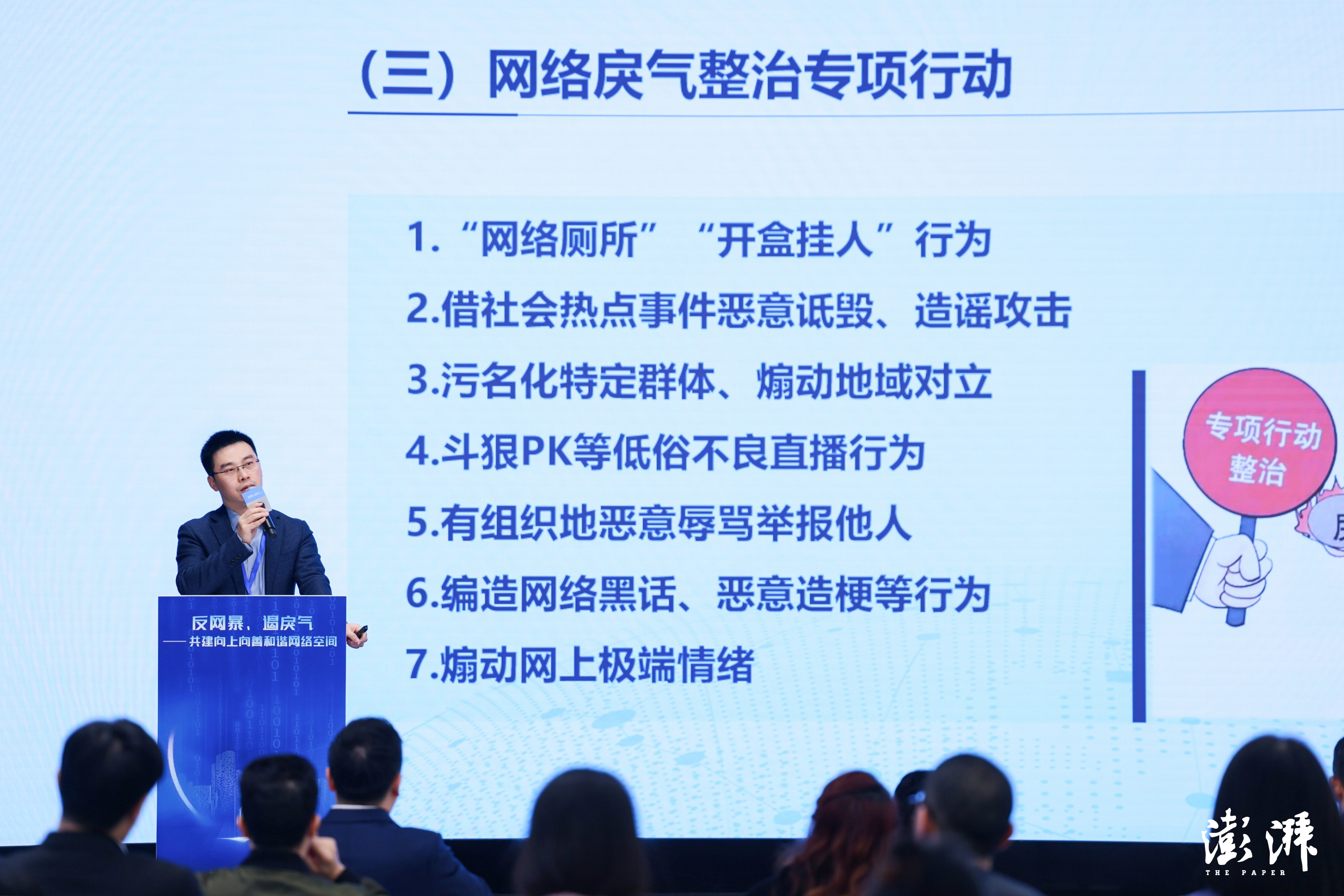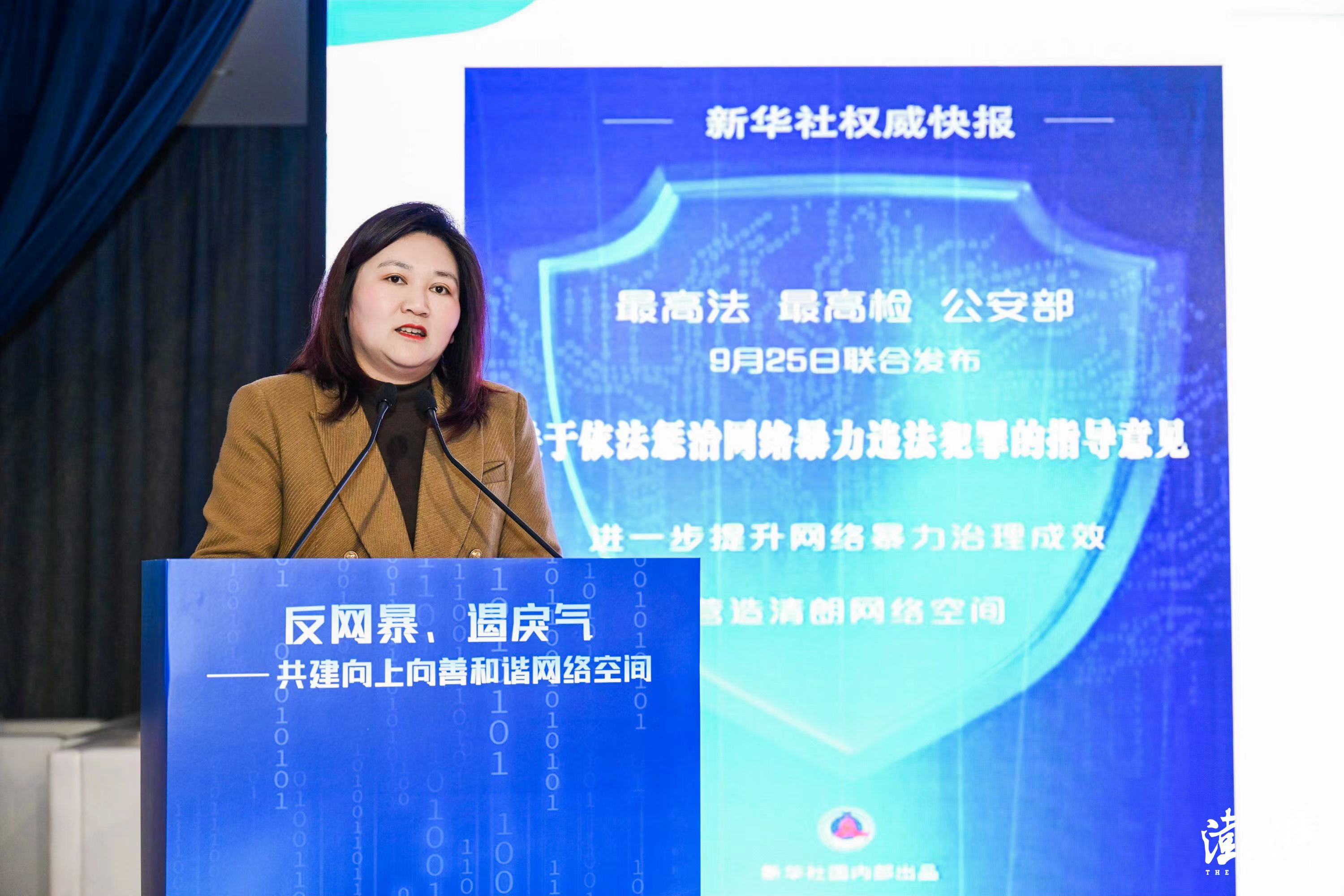 上海市委网信办副主任俞旻骁作主旨发言,分享网络暴力治理的重点,强调要压实网站的主体责任,在风险预警、防扩散、受害人保护上有所作为;要发挥协同联动的作用,网信办与公安、检察院、法院等部门一起建立相应的网络治理协同联动机制;要强化法制保障,坚持亮利剑、出重拳;要培育网络文明,持续净化网络生态空间。