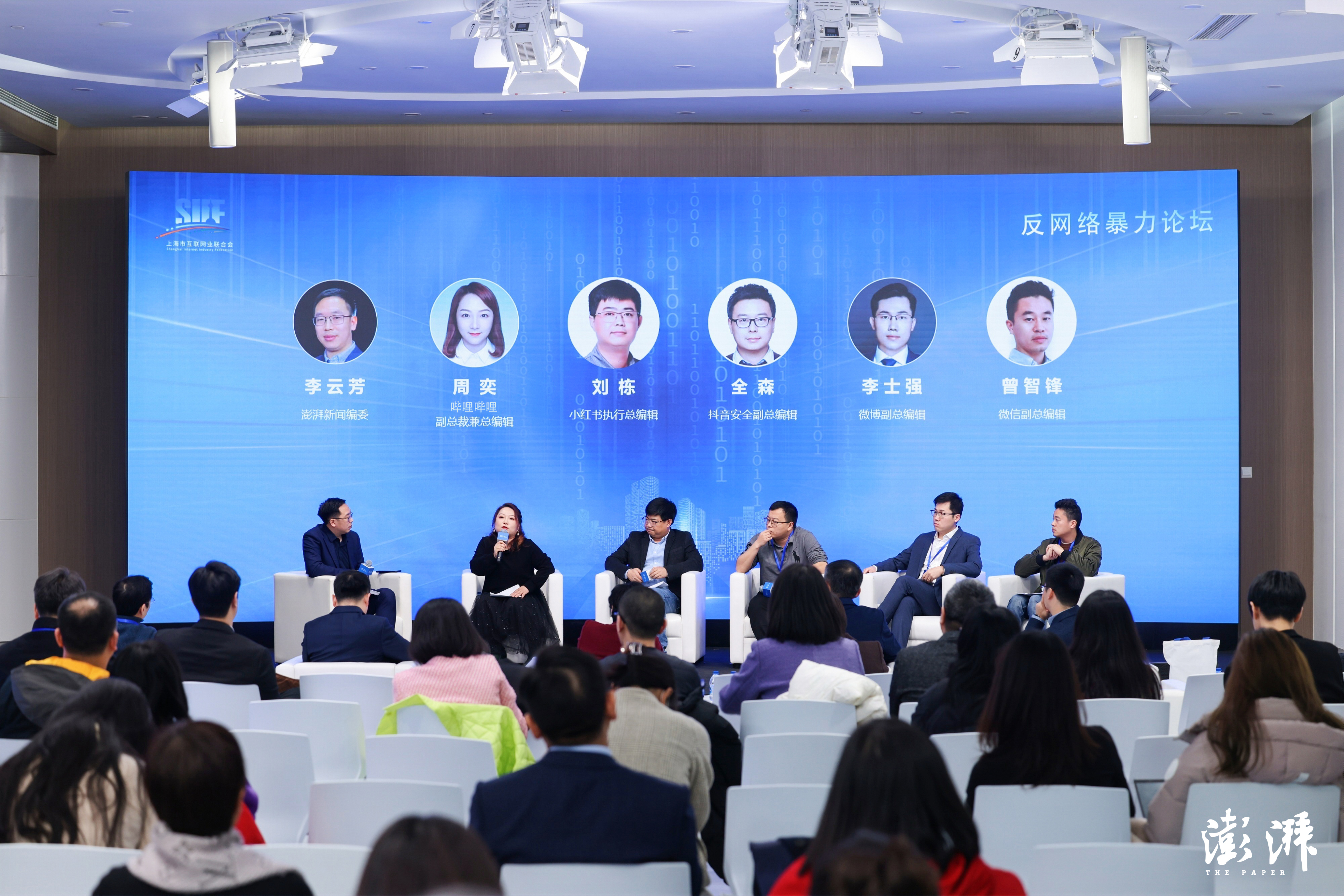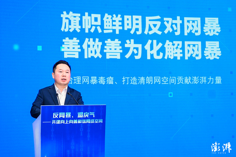 圆桌环节,哔哩哔哩副总裁兼总编辑周奕、小红书执行总编辑刘栋、抖音安全副总编辑全森、微博副总编辑李士强、微信副总编辑曾智锋就“如何共同抵制网络暴力,构建和谐网络环境”展开了讨论,澎湃新闻编委李云芳任主持人。参与讨论的嘉宾认为,网络暴力已经成为网络的公害,进行抵制、处置已经是全民的共识,希望通过大家的合力可以实现网上无暴。