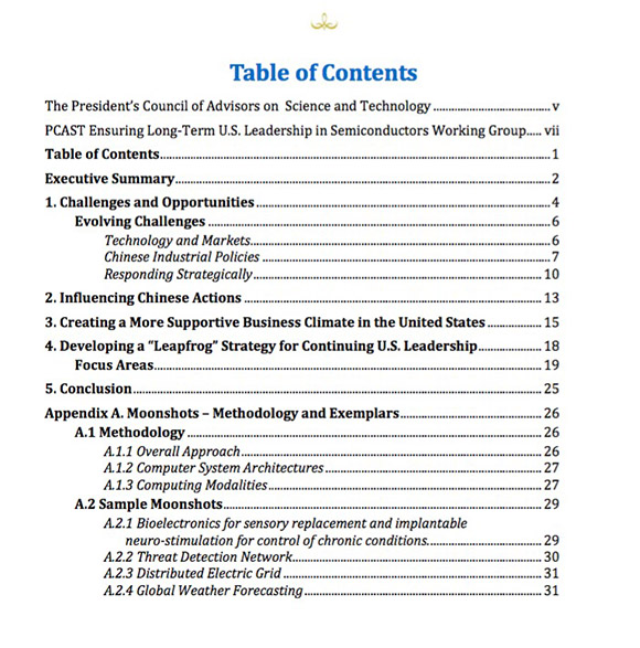 该报告共有44页(报告全文链接),发文单位是美国总统科技顾问委员会(PRESIDENT’S COUNCIL OF ADVISORS ON SCIENCE AND TECHNOLOGY= PCAST,下文简称“委员会”)。报告从中美半导体发展现状、中国给美国带来的威胁、具体建议等方面论述了委员会的观点。
