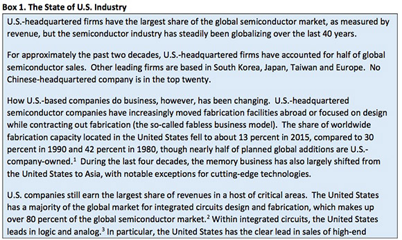 其中有一部分原因是人力成本上升,许多公司愿意将总部迁出,使美国制造业外流。报告中提供的数据是:世界范围内,总部位于美国的制造业公司(含芯片厂商)从1980年的42%,降到1990年的30%,2015年这个数字只有13%了。