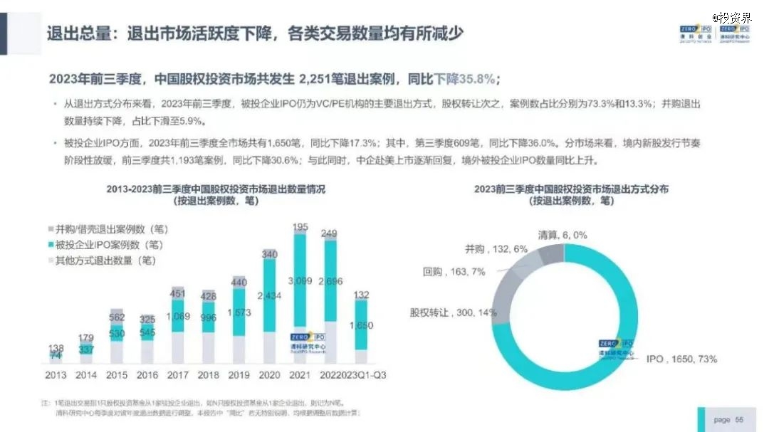 清科研究中心发布的《中国VC/PE市场最新全景图》显示,退出方面,2023年前三季度,中国股权投资市场共发生2251笔退出,同比下降35.8%。而在沪深两市新股发行阶段性放缓背景下,被投企业IPO案例数相应减少,前三季度全市场共有1650笔,同比下降17.3%。
