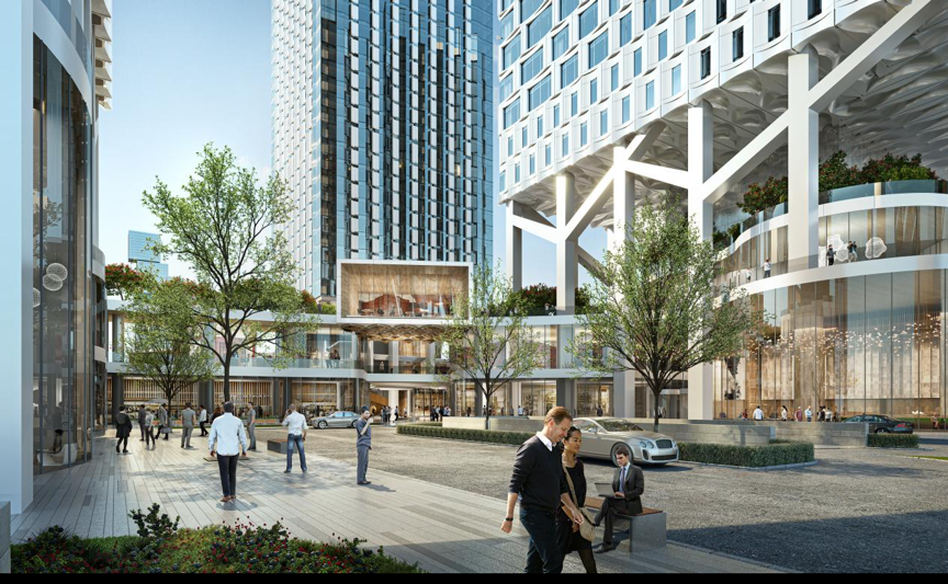 项目亮点四:独创38米挑高架空层,为社区、空间交互赋能,项目在设计中,为了打破传统建筑对社区整体空间的束缚,创新性的采用了全架空的建筑布局,其中1#超甲级写字楼、3#甲级写字楼,均采用了从商业地下2层至办公地上3层30余米的超高跨度单体柱,2#商务公寓楼也采用了近20米的三层单体柱架空。架空设计下,项目又创新性的采用全钢板混凝土结构,保障建筑结构安全、稳定,以付出普通建造2倍以上的成本代价,为项目空间交互价值赋能。