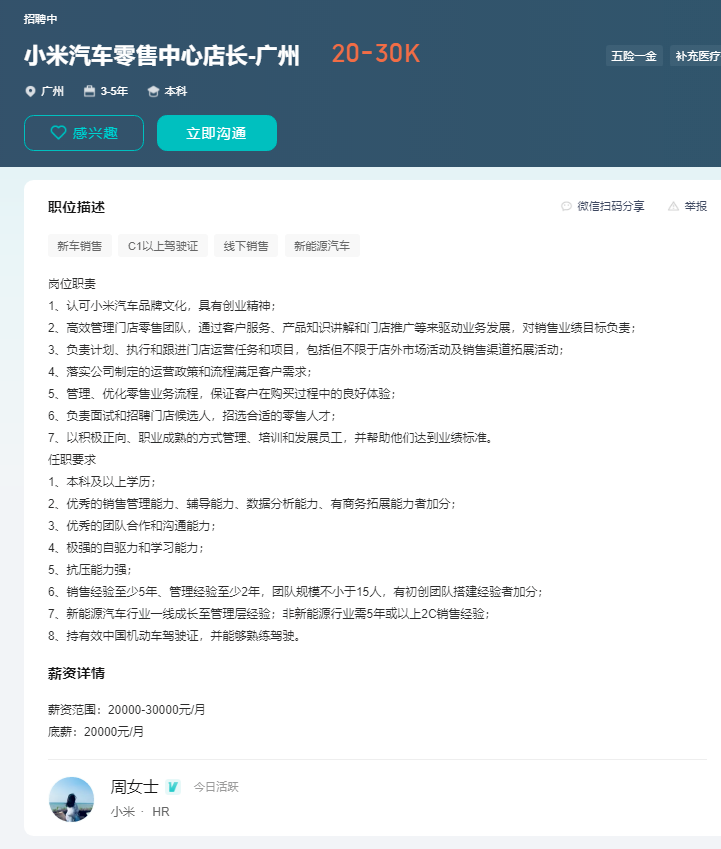 值得注意的是,首批招募的销售员工,并不是在小米之家任职,而是在独立的汽车门店带队。