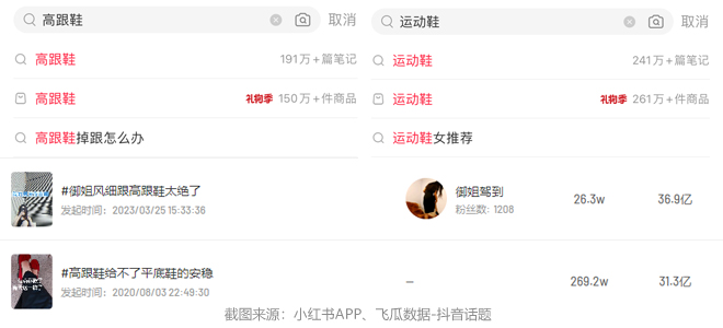 与近年户外运动风有关,小红书上关于【高跟鞋】的笔记有191万+篇笔记,其中不乏关于穿高跟鞋不舒适的内容;而【运动鞋】笔记有241万+篇,以穿搭及产品推荐为主。