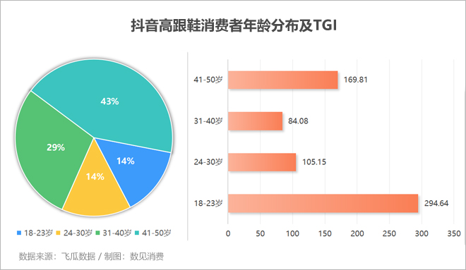 抖音电商高跟鞋品类的消费群体呈大龄化趋势。18-23岁人群占比14.29%,24-30岁人群占比14.29%,31-40岁人群占比28.57%,41-50岁人群占比最大,为42.86%。