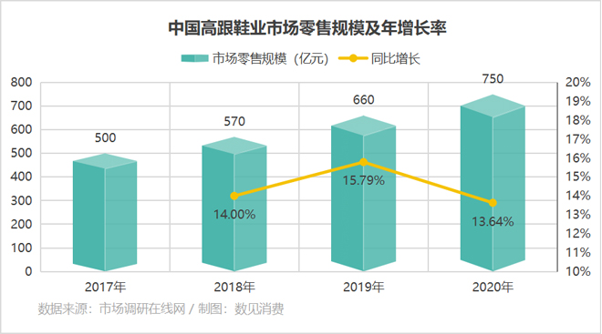 2017年至2020年中国高跟鞋零售市场规模分别为500亿元、570亿元、660亿元,750亿元,同比增长率维持在13%-16%之间。但显然,2020年增速有所下滑。