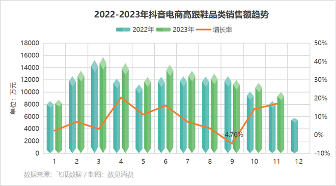 观察抖音上高跟鞋品类近两年数据发现,增速较为平缓,最高同比增长率为今年4月20.4%,最低为9月出现负增长,同比增长-4.76%。2023年1-11月总计销售额同比增长仅为3.85%;