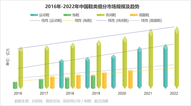 眼下的女鞋市场细分为休闲鞋、运动鞋、高跟鞋、拖鞋等多个子市场,消费者们的购买选择更多了。在各种鞋类竞争中,近年市场规模增速最快的为运动鞋品类,其次为休闲鞋。
