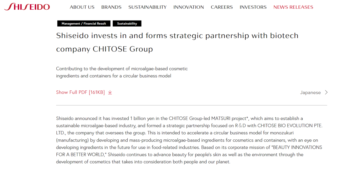 7月11日,资生堂集团宣布,已向由生物科技公司千岁(CHITOSE)集团主导的MATSURI项目投资10亿日元(约合人民币5500万元),并与后者旗下的千岁生物工程有限公司(CHITOSE BIO EVOLUTION PTE. LTD.)建立了以研发为核心的战略合作伙伴关系。