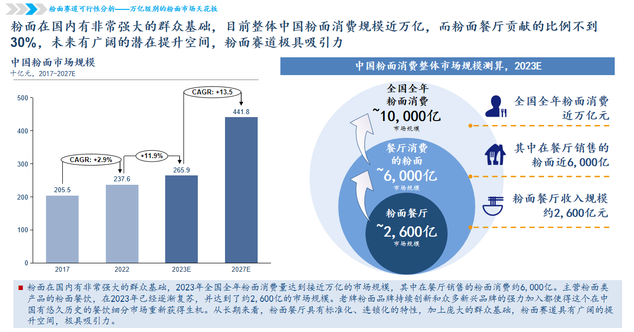 在众多细分赛道中,粉面是我们重点关注的。粉面餐厅具有标准化、连锁化的特性,大单品属性强,在国内外都有庞大的群众基础,是最有可能跑出巨无霸的赛道之一。我们测算了2023年全国全年粉面消费量,有接近万亿的市场规模,其中粉面餐厅贡献的比例不到30%。长期来看,粉面赛道具有广阔的提升空间,极具吸引力。