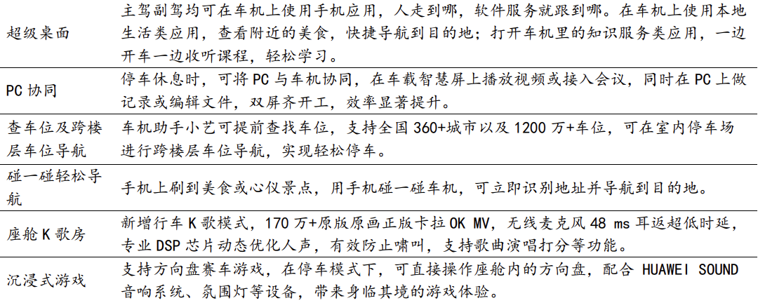 此外,据方正证券报道,超级桌面、PC协同、查车位及跨楼层车位导航、碰一碰轻松导航、座舱K歌房、沉浸式游戏等车机功能,都是华为赋能车机系统的表现。