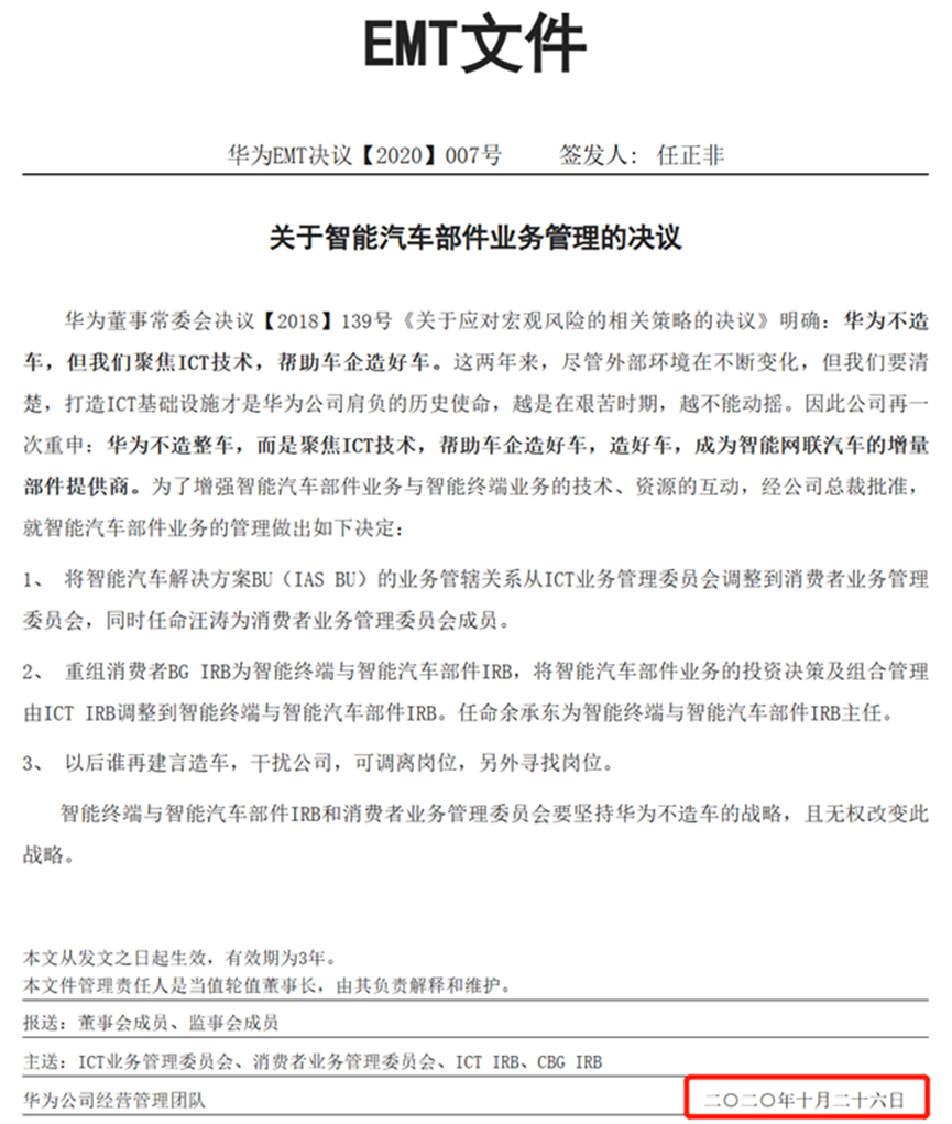 2020年10月,华为了签署不造车决议,原本到今年10月,任正非签署为期的3年《华为不造车决议》即将过期,而这份文件的过期,也意味着不造车的思想钢印彻底解放。