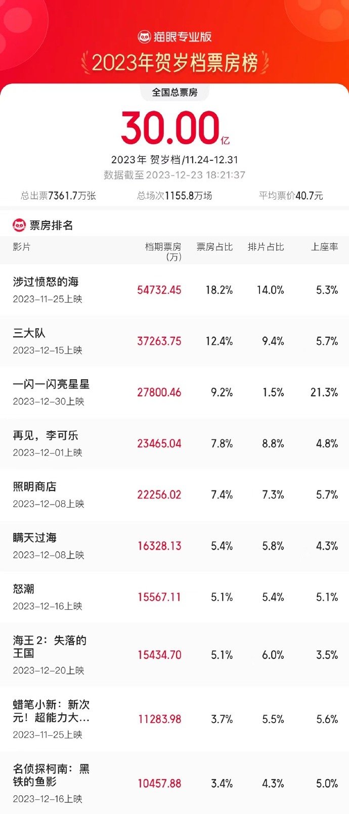 据猫眼专业版数据,截至12月23日18时21分,2023年贺岁档(11月24-12月31日)总票房(含预售)破30亿。 《涉过愤怒的海》《三大队》《一闪一闪亮星星》分列贺岁档票房榜前三。