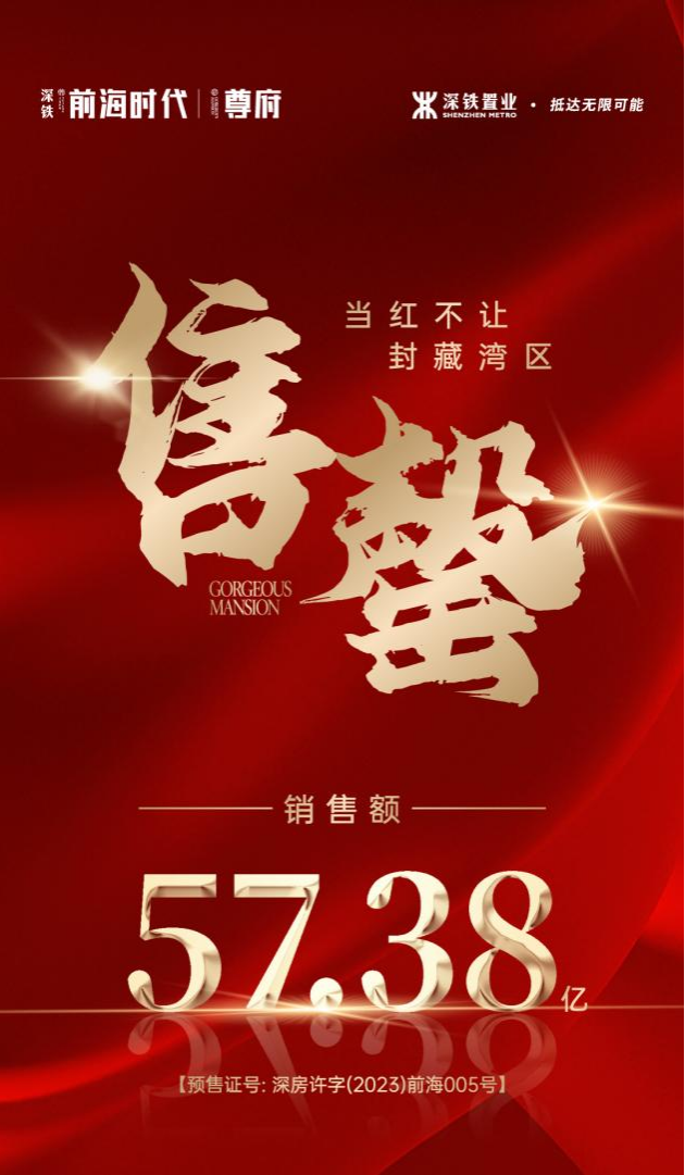 前海桂湾的城市地标,集高端住宅、国际公寓、总部办公、风尚商业、精品酒店等多种业态于一体的城市配套……近日,深铁集团在前海打造的首个超百万平方米TOD综合体内的高端住宅产品——深铁前海时代·尊府(以下简称“尊府”)迎来重磅入市。据数据统计,12月20日,冻资入围人数达553批;12月23日,本次推出的270套高端住宅产品仅6个小时全部售罄,销售金额超57.38亿元,为市场又交出了一份产品过硬、数据优异的成绩单。