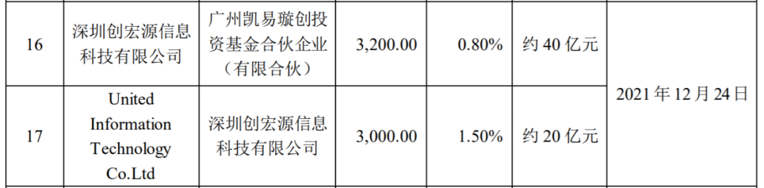 2021年12月24日,UIT将创新科1.50%股权转让予深圳创宏源信息科技,总对价3000万元,估值约20亿元。但就在同一天,深圳创宏源信息科技向广州凯易璇创投转让了0.80%股权,对价3200万元,估值翻倍达到40亿元。