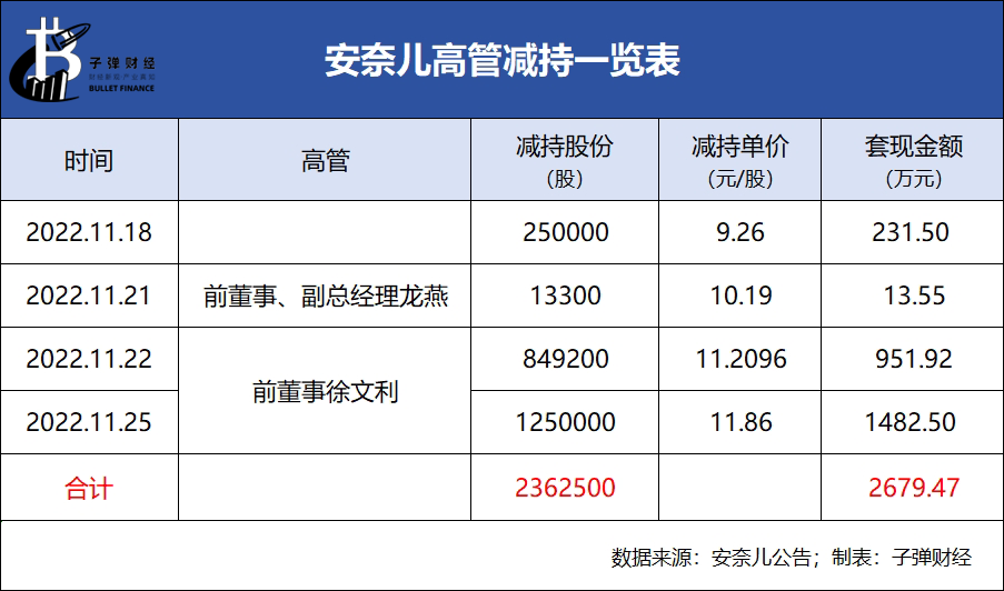 在这期间,有高管多次减持股份。据「子弹财经」不完全统计,2022年11月18日至25日,时任董事、副总经理龙燕、时任董事徐文利合计减持236.25万股股份,套现约2600万元。