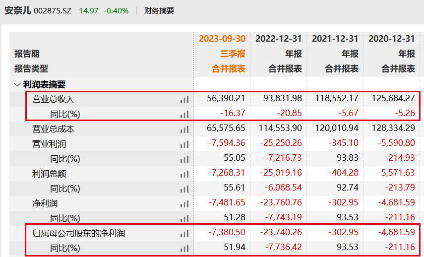 与此同时,归母净利润由盈转亏。同期,其归母净利润分别为-4681.59万元、-302.95万元、-2.37亿元与-7380.50万元。不到4年时间,安奈儿的亏损额累计达到3.61亿元。