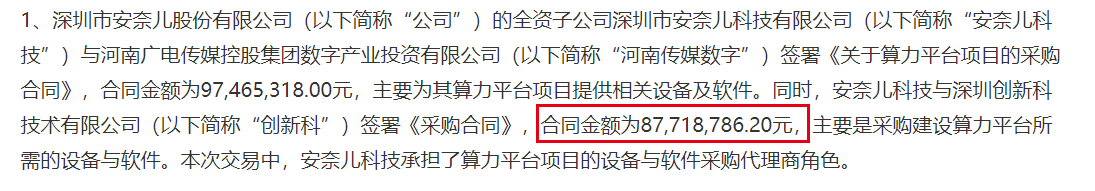 同一天,安奈儿宣布,子公司安奈儿科技与创新科签署采购合同,主要采购建设算力平台所需的设备与软件,合同金额为8771.88万元,而这些产品将经由安奈儿科技销往河南传媒数字。