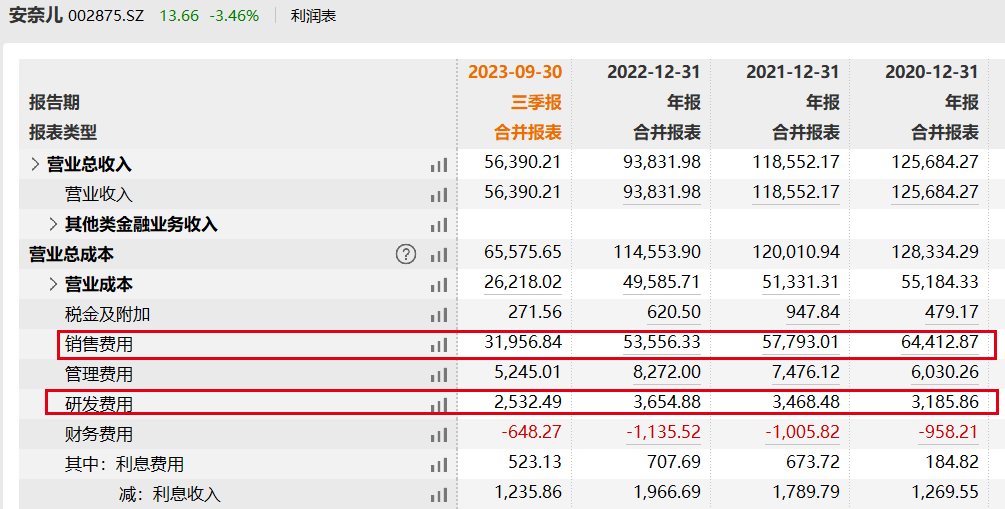 Wind数据显示,2020年-2023年9月,其销售费用分别为6.44亿元、5.78亿元、5.36亿元、3.20亿元;研发费用分别为3185.86万元、3468.48万元、3654.88万元、2532.49万元。