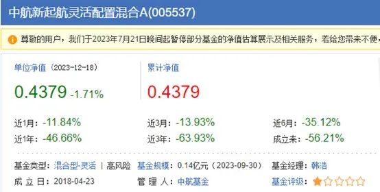 倒数第二名是“中航新起航灵活配置基金”,年内收益为-49.81%,也可谓“腰斩”。